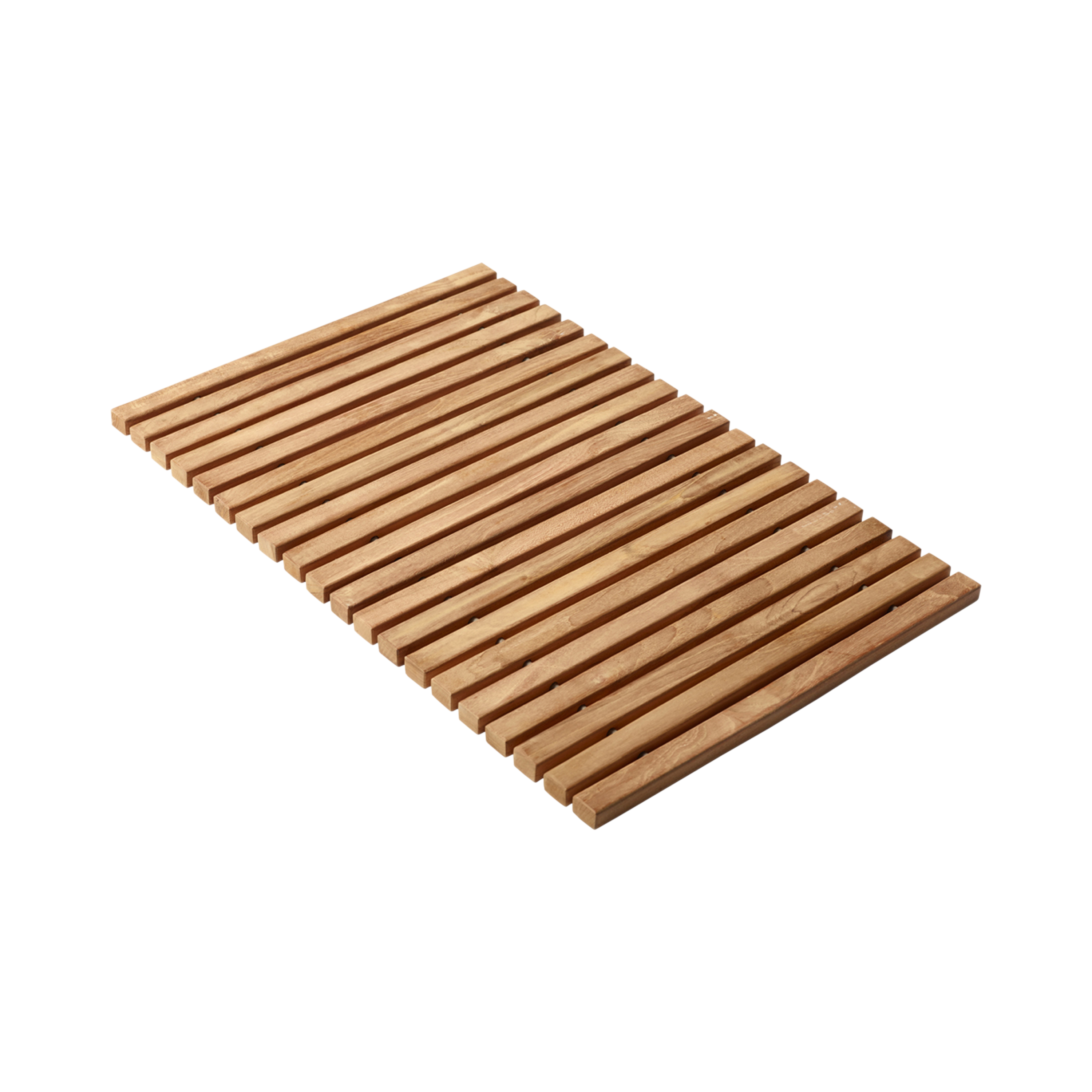 Indendørs er størrelsen ideel som klassisk bademåtte foran brusenichen eller badekarret, hvor de solide teaklameller giver en behagelig og ventileret overflade, som vand let kan løbe af.