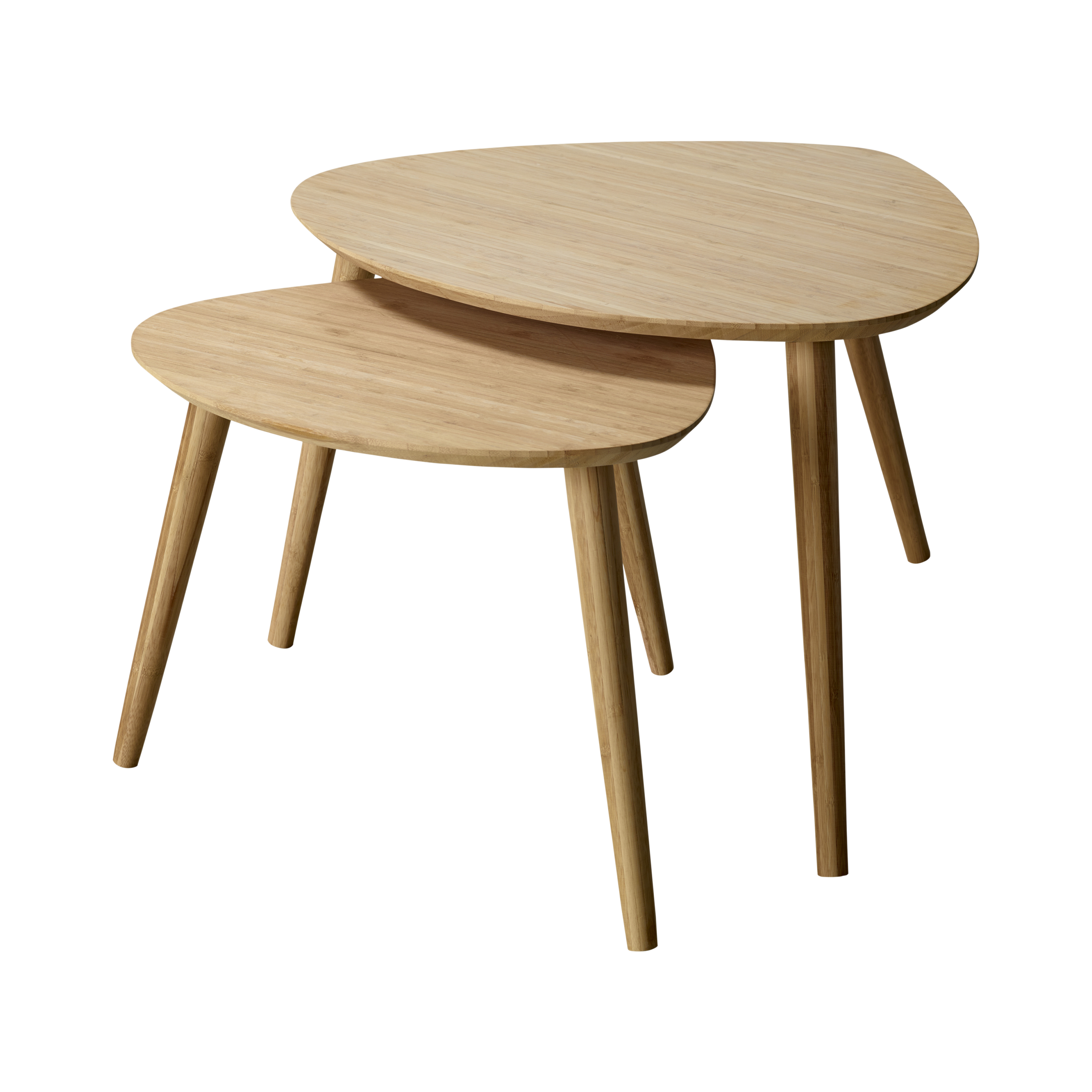 To indskudsborde i forskellig højde med et enkelt, organisk formsprog – fleksible i brug og udført i bambus, der giver et varmt og naturligt udtryk.