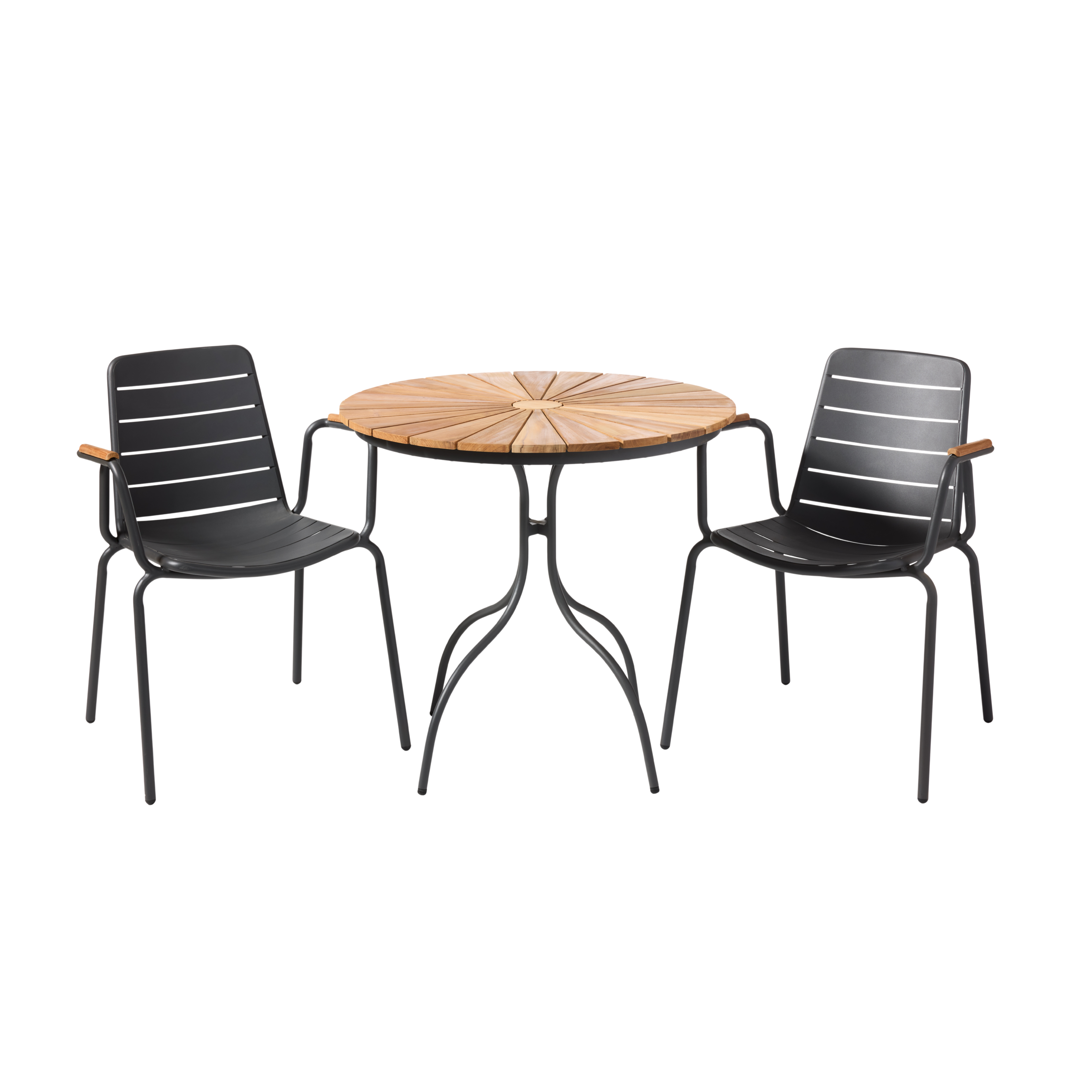 Et cafésæt med let fransk stemning og nordisk ro. Ellen cafébordet i teak og to Parc-stole i antracit skaber en elegant ramme om kaffe, croissanter og små øjeblikke i solen.