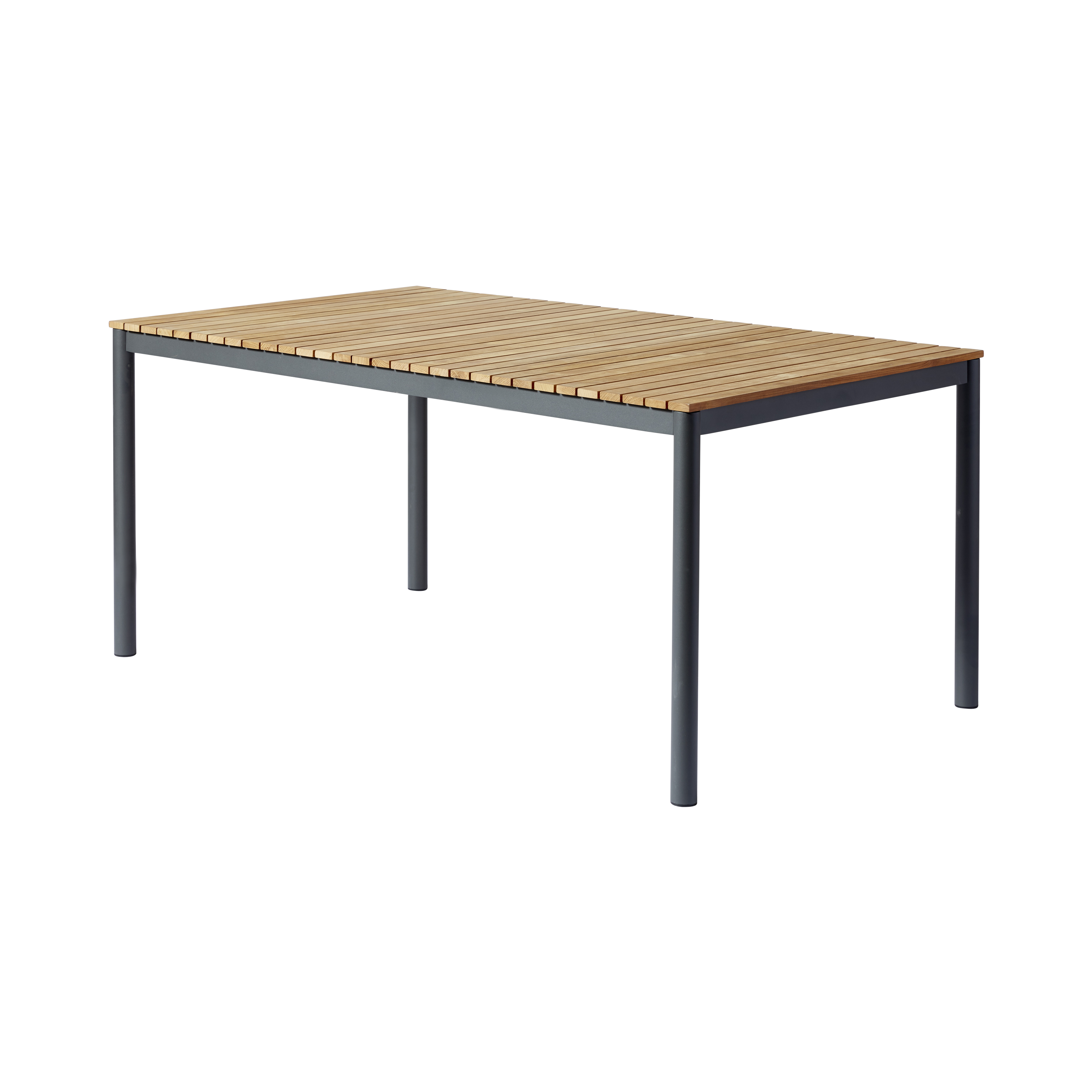 Bordpladen er udført i teak, som tilfører varme, karakter og et naturligt udtryk, mens stellet i pulverlakeret aluminium i antracit giver stabilitet og et let, moderne modspil. Kombinationen af materialer gør bordet robust, vejrbestandigt og nemt at integrere i mange typer uderum.