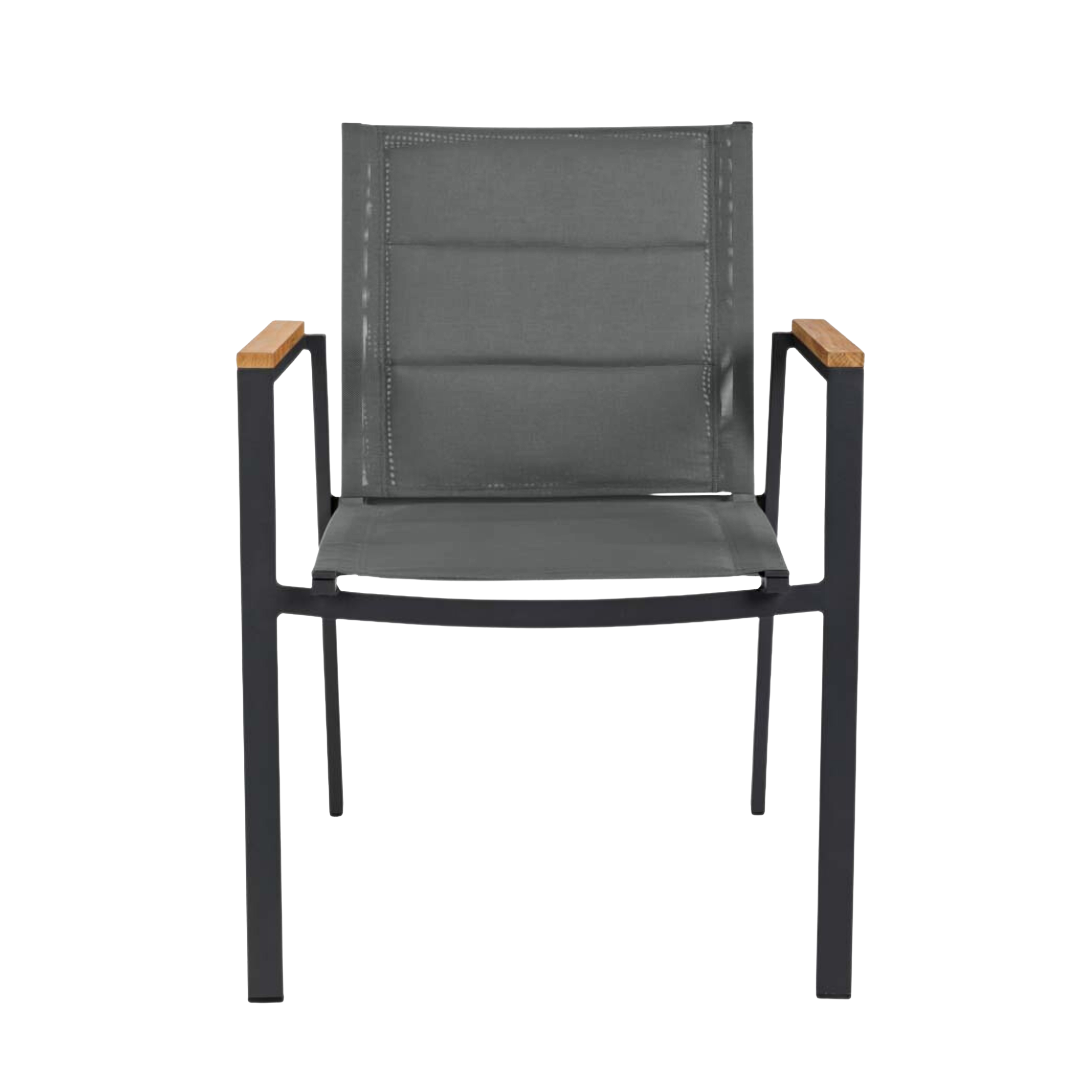 Det antracitgrå aluminiumsstel kombineret med teak-armlæn og det dobbeltsidede vævede mesh giver stolen et elegant, luftigt og raffineret udtryk, som passer perfekt til alt fra terrasser, over gårdhaver til moderne arkitektur.