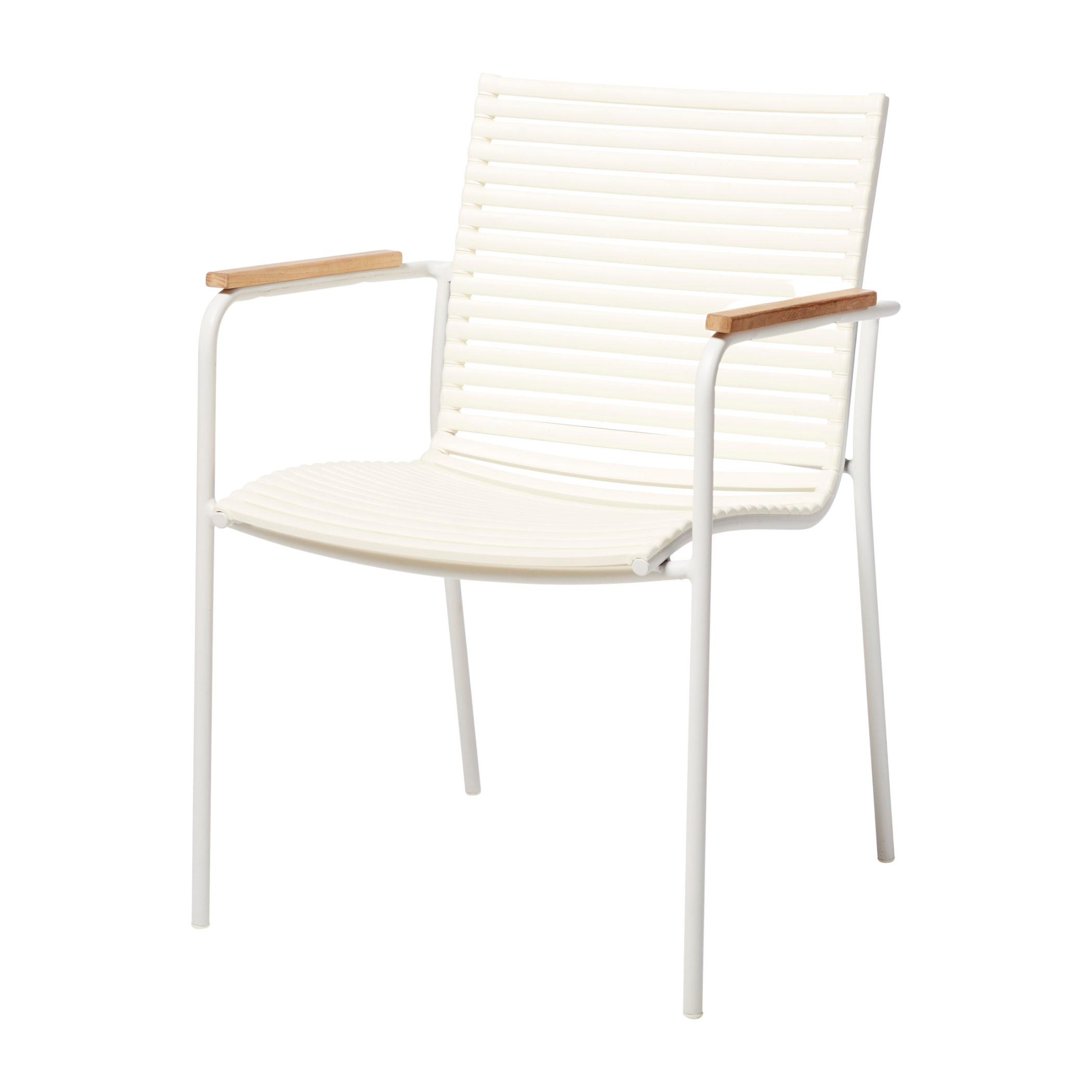 En elegant og let stol i hvidlakeret aluminium med teak-armlæn og smalle, vejrbestandige lameller — med mulighed for at udskifte lamellerne og tilpasse stolens udtryk efter stil og sæson.