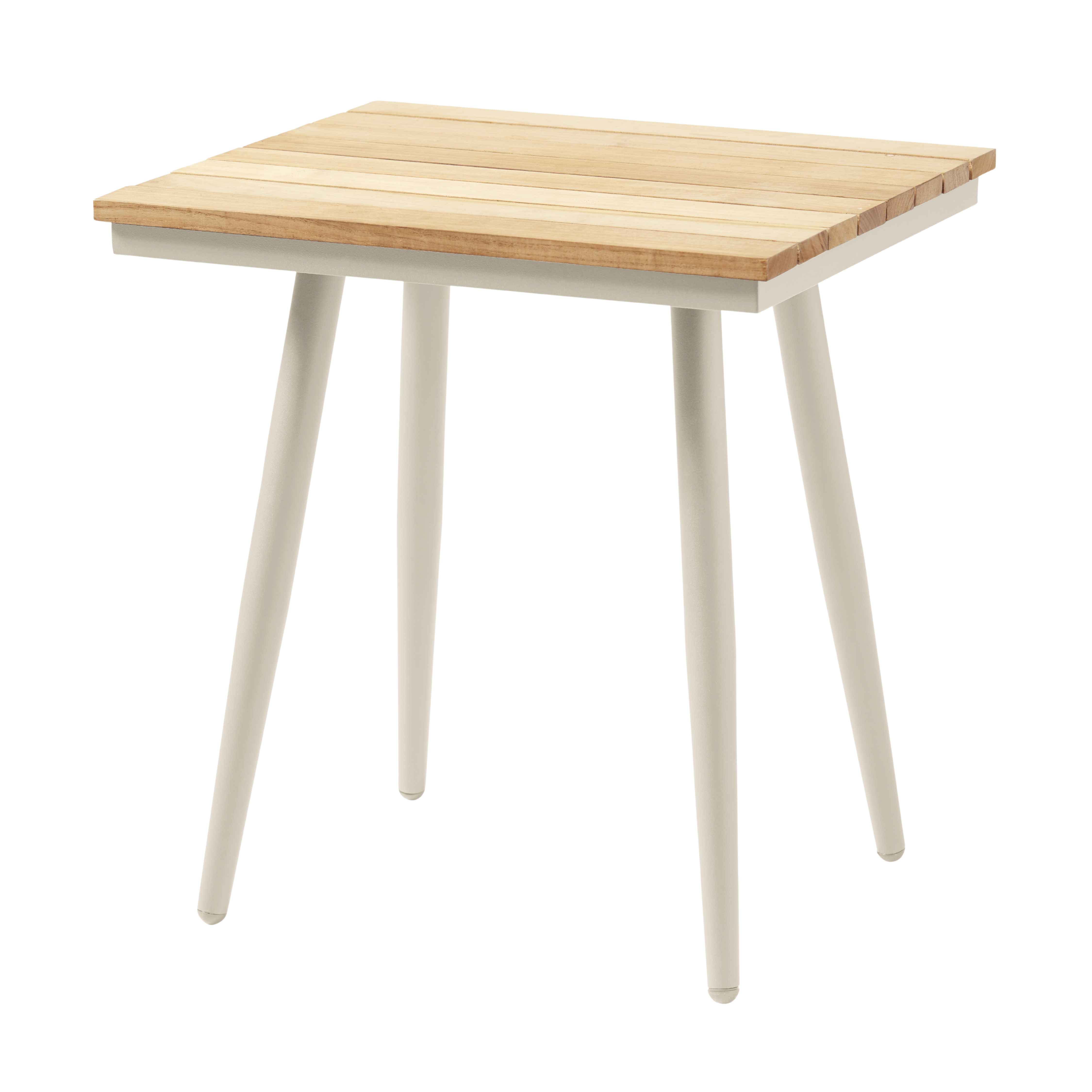 Stilrent sidebord i sandfarvet aluminium med bordplade af teaklameller. Et tidløst design, der tilfører ro og charme til ethvert loungeområde.