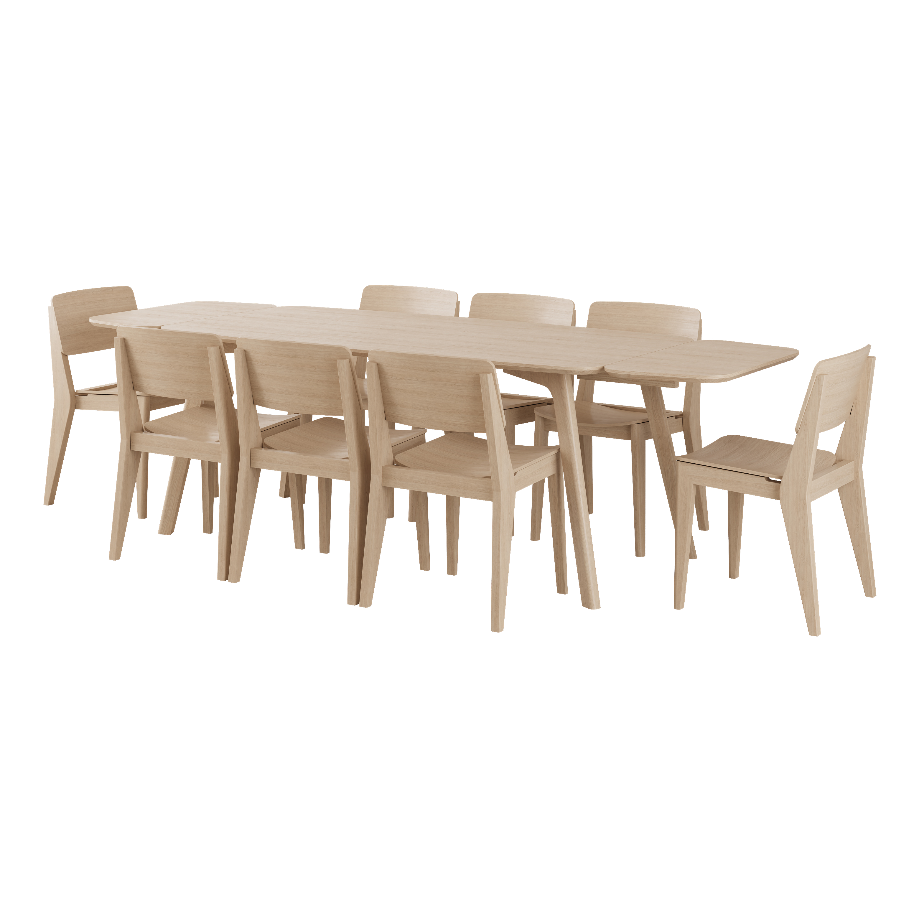 Elvo-sættet forener det aflange spisebord, seks stole og matchende tillægsplader i ét samlet udtryk, hvor lethed og styrke går hånd i hånd.