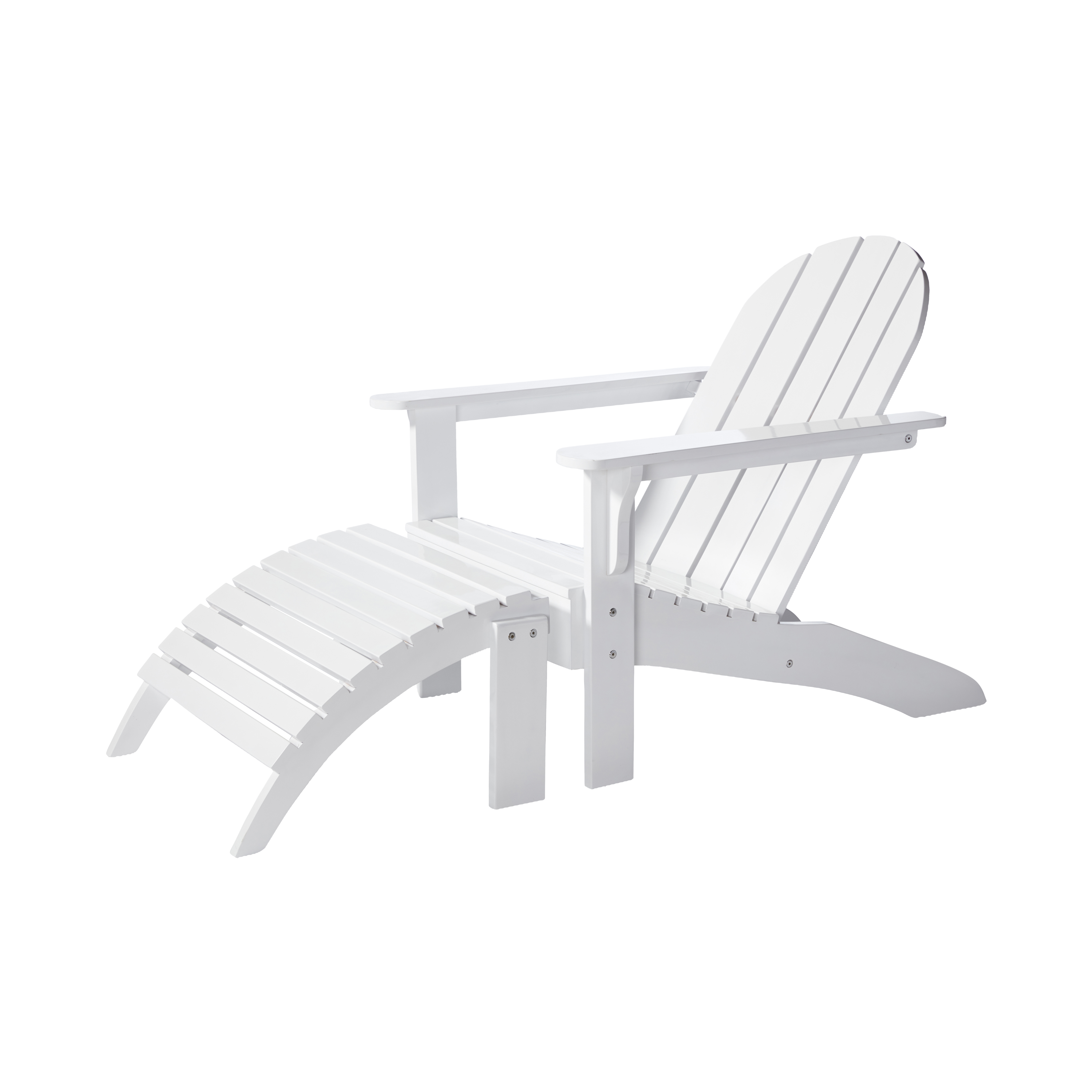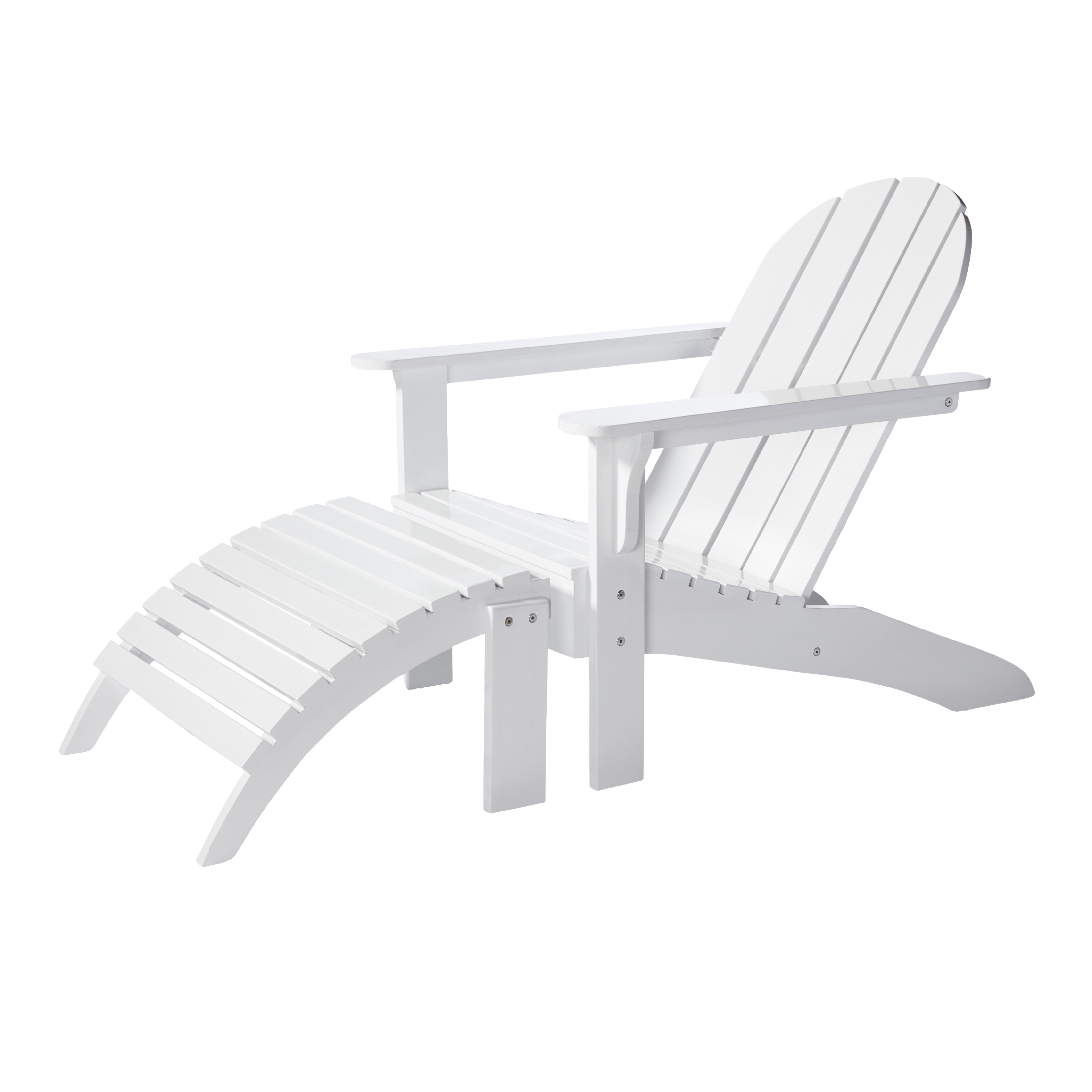 Adirondack stolen og fodskamlen danner tilsammen et udendørs hvilested i hvidmalet mahogni – skabt til ro, komfort og kvalitet i det fri.