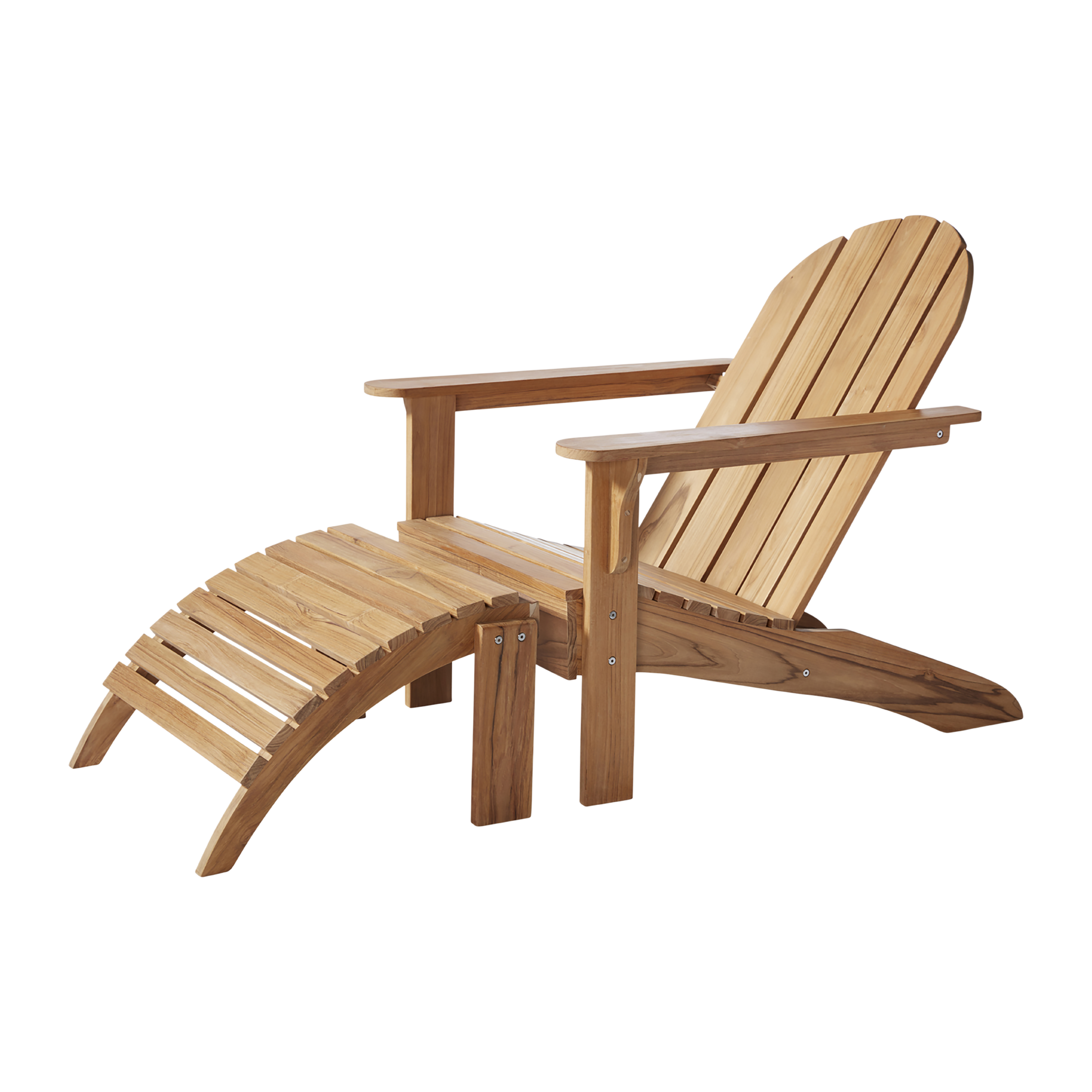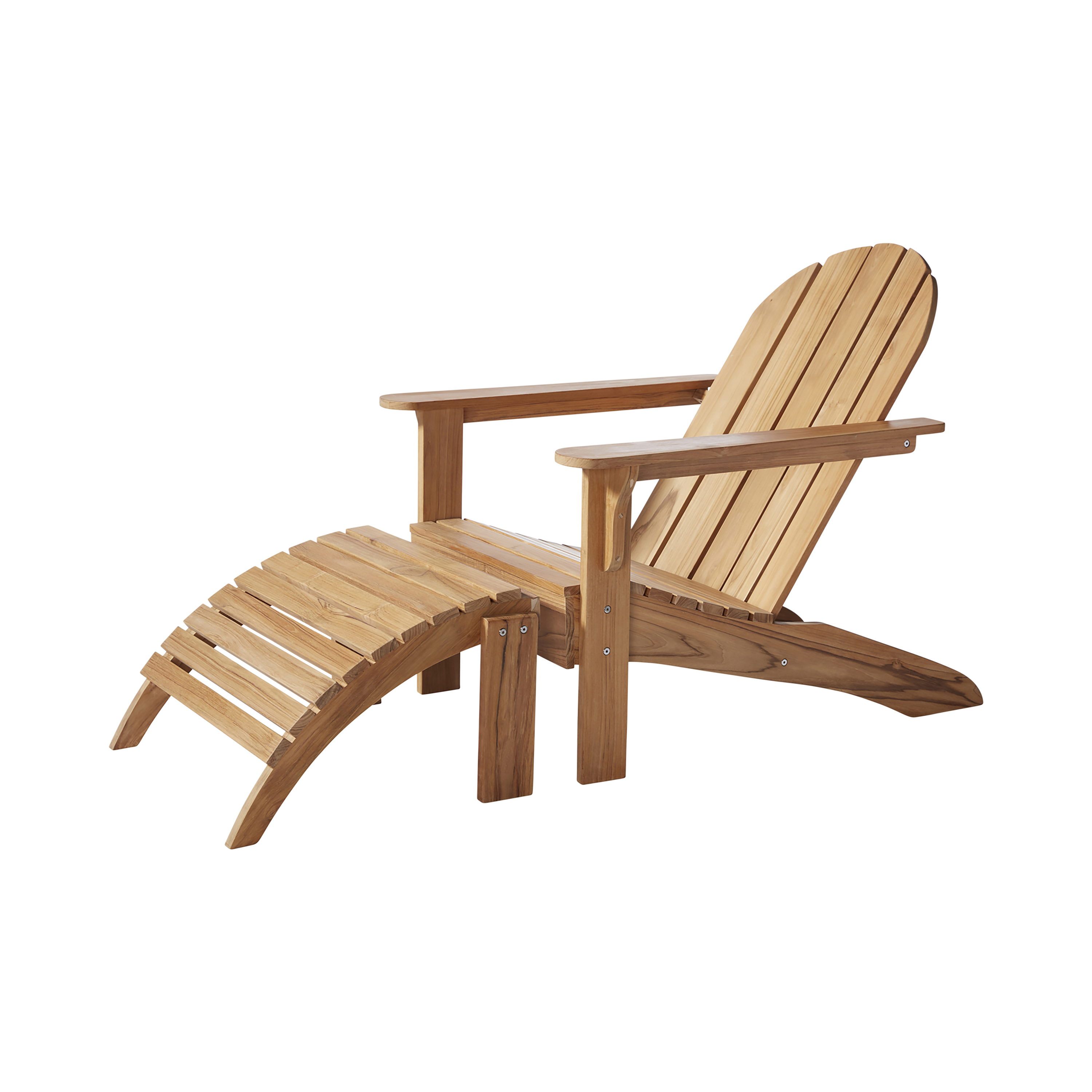 Adirondack stolen og fodskamlen danner tilsammen et udendørs hvilested i teak, skabt til ro, komfort og kvalitet i det fri.