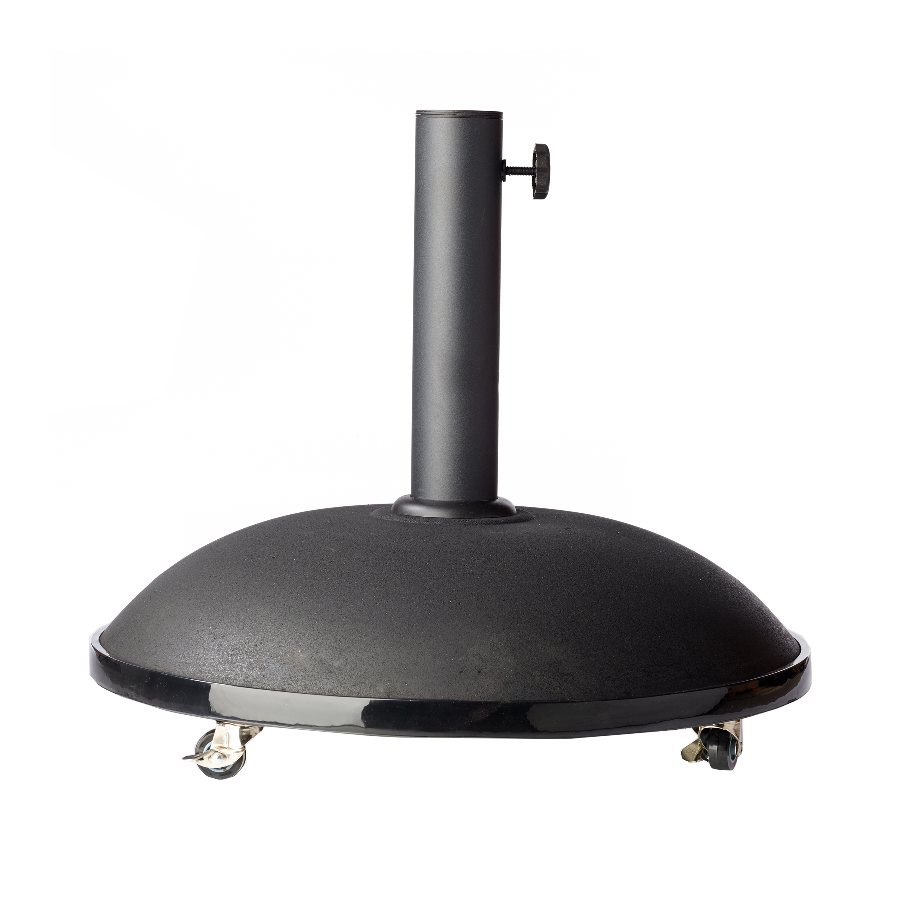 En solid parasolfod i sortfarvet beton på 50 kilo – med hjul for nem flytning og kompatibel med langt de fleste parasoller.
