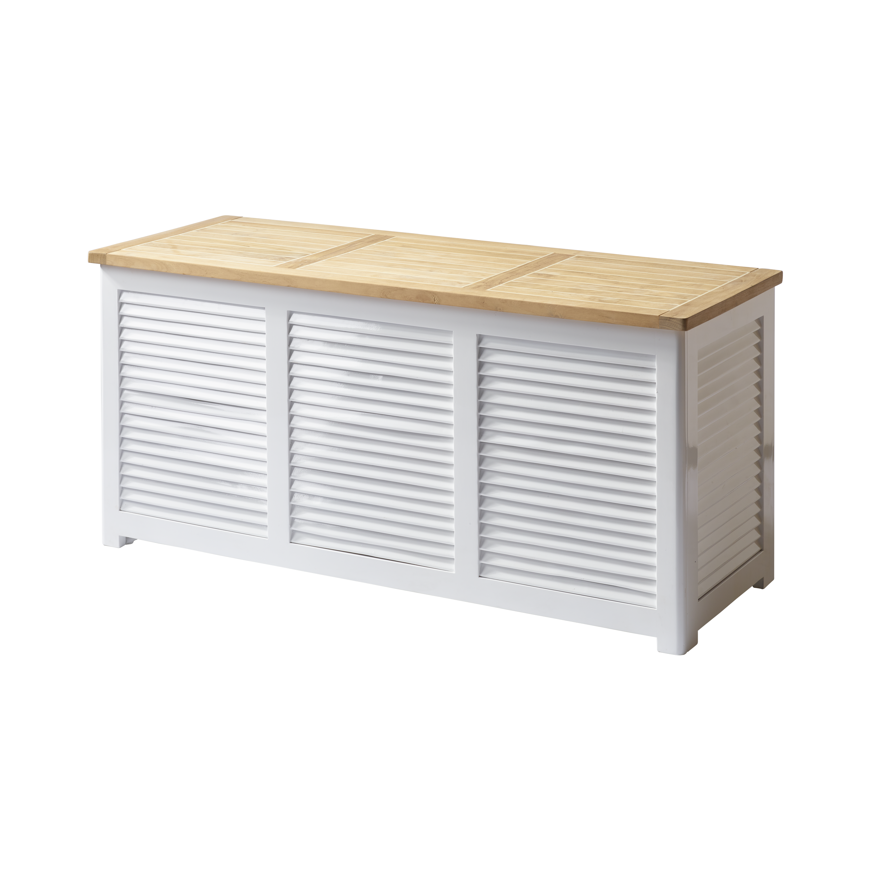 Everyday hyndeboksen i hvidmalet mahogni med teaktræslåg er en rummelig og praktisk løsning til opbevaring af hynder, puder og andre ting, du gerne vil holde tørre og samlede – både ude og inde.