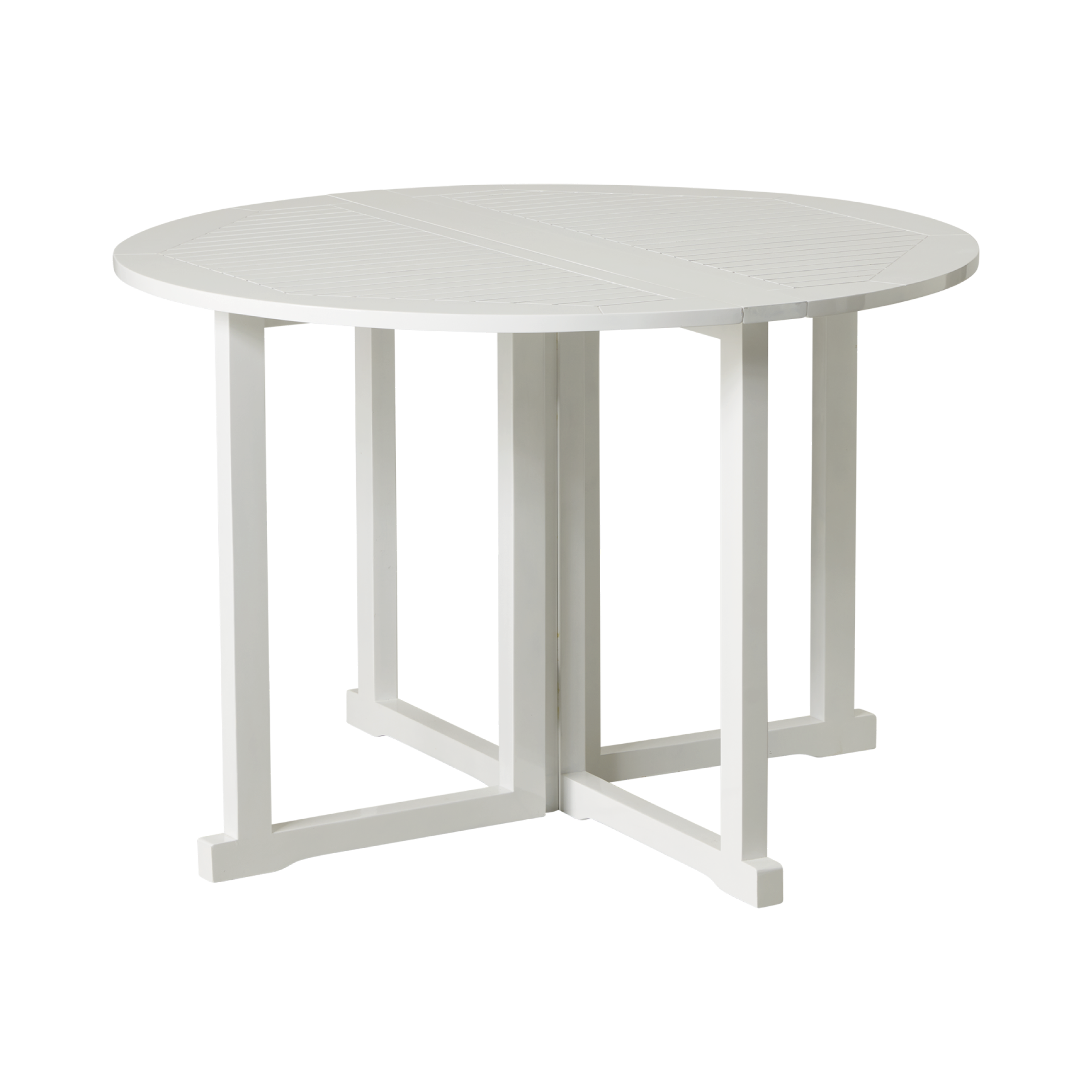 Et elegant og fleksibelt foldebord i hvidmalet mahogni — perfekt til intime uderum, hvor hygge, samvær og et lyst, let udtryk går hånd i hånd.