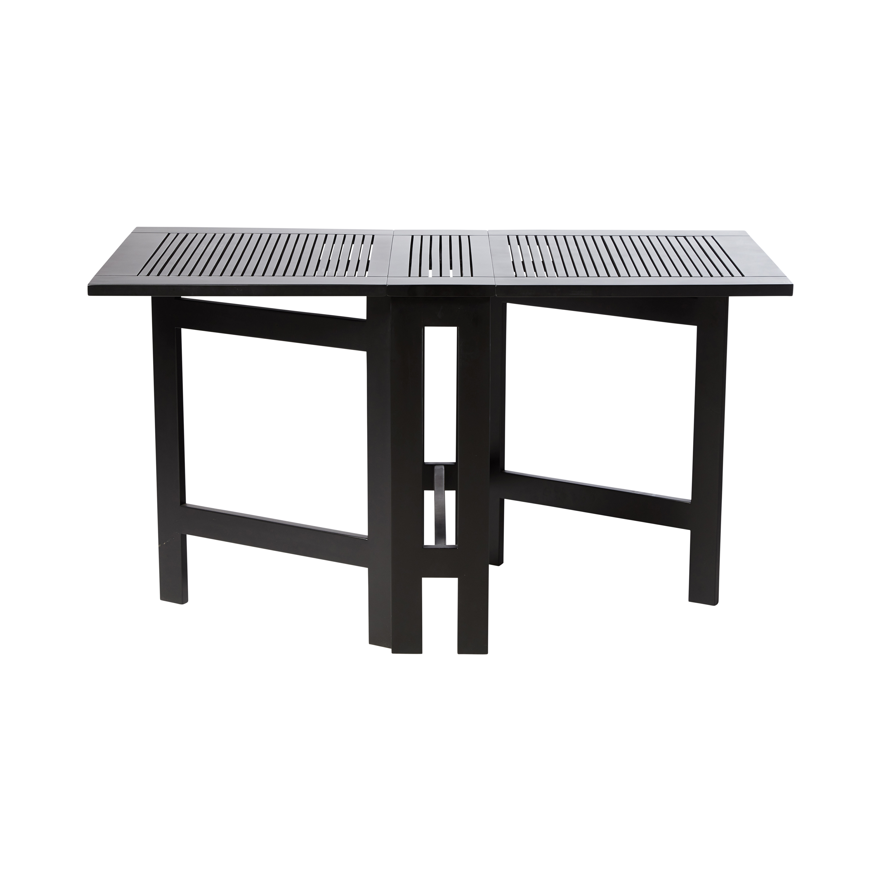 Et elegant og fleksibelt, aflangt klapbord i sortmalet mahogni — skabt til uderum med varierende behov, hvor bordet skal kunne fylde lidt, lidt mere eller meget.