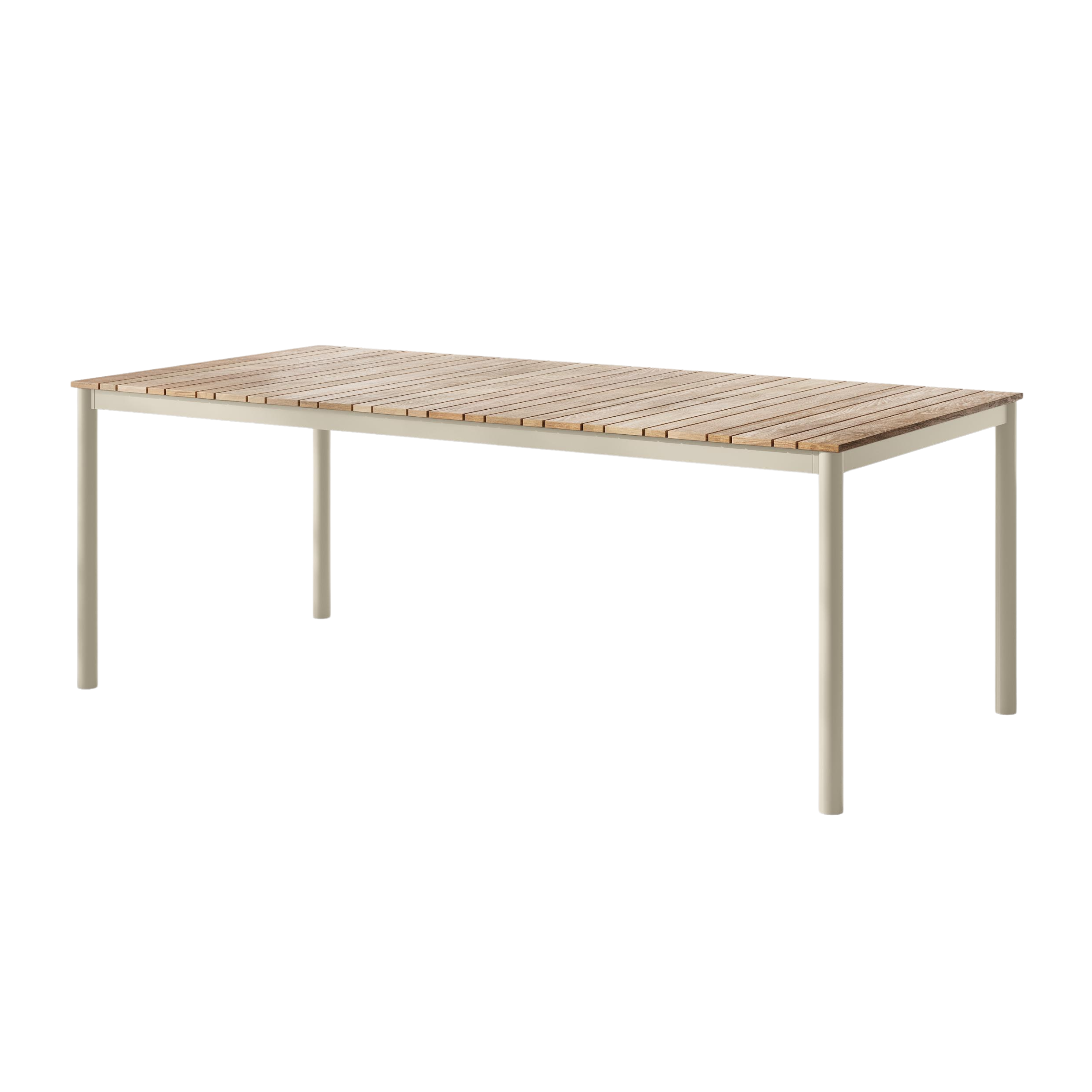 Det sandfarvede aluminiumsstel kombineret med teaklameller i to forskellige bredder giver bordet en varm og tidløs karakter, hvor det diskrete spil i overfladen tilfører et moderne og sofistikeret udtryk.