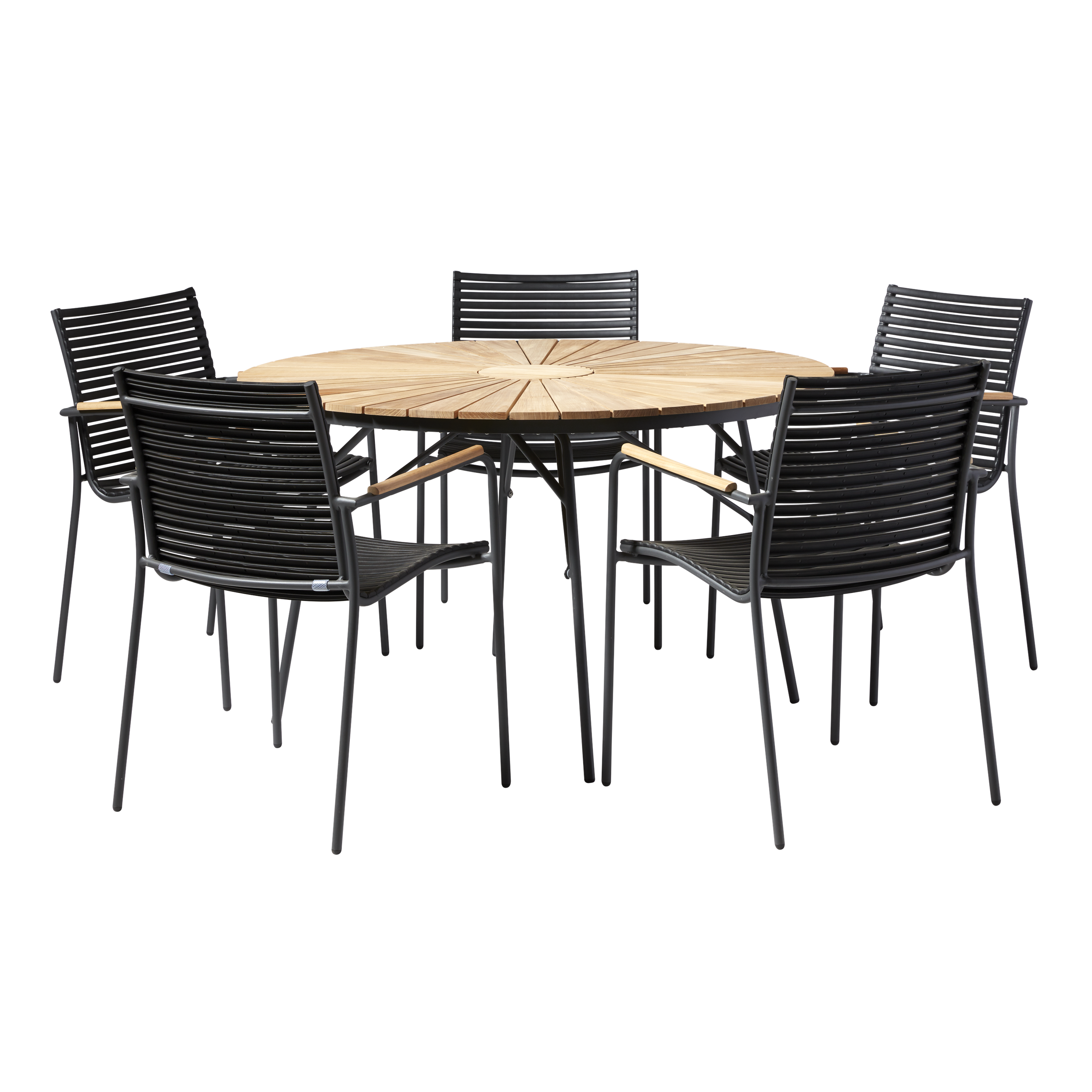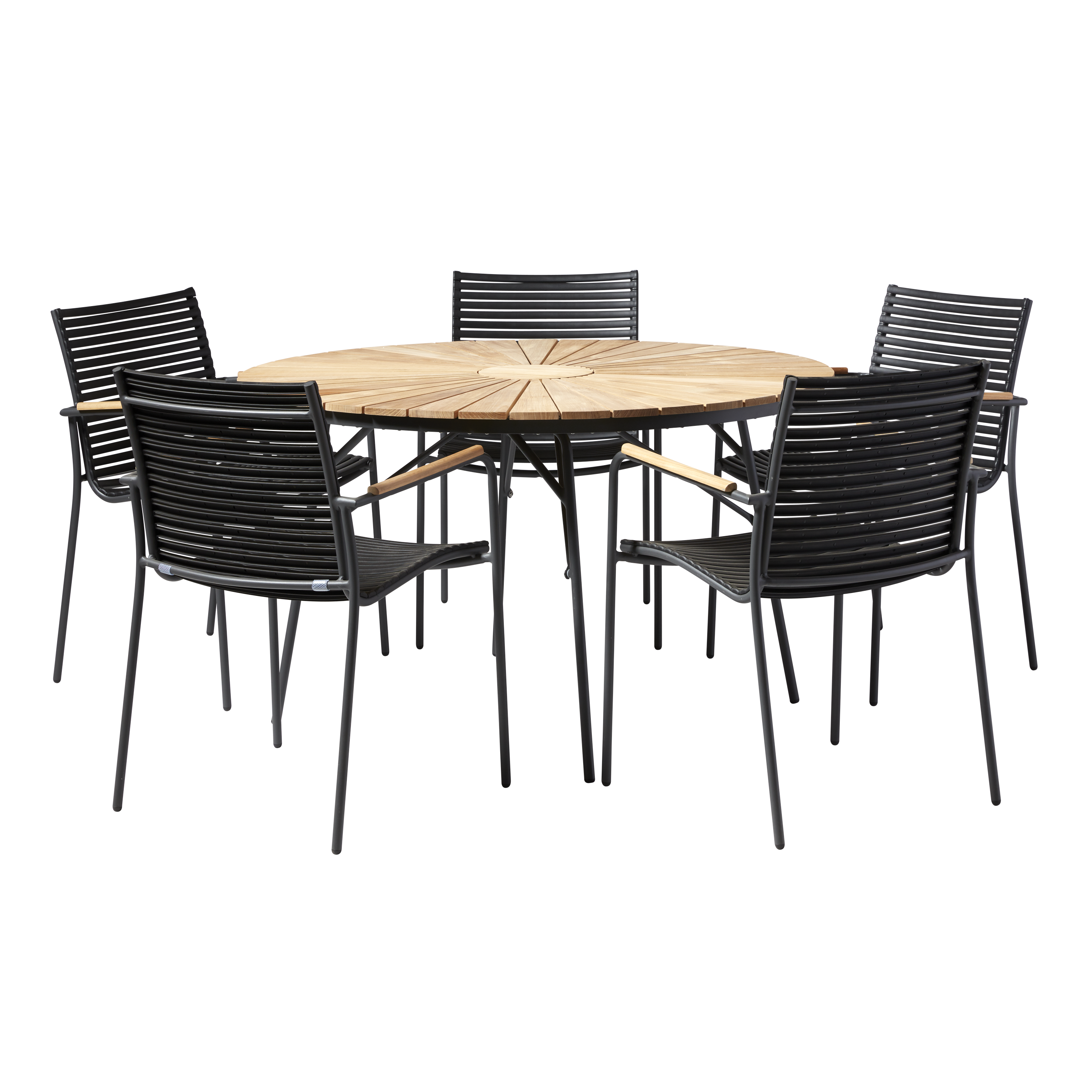 Ellen bordet i 130 centimeter i diameter danner sammen med fem Mood Classic stole et indbydende og velafbalanceret udendørssæt, hvor der er god plads omkring bordet.
