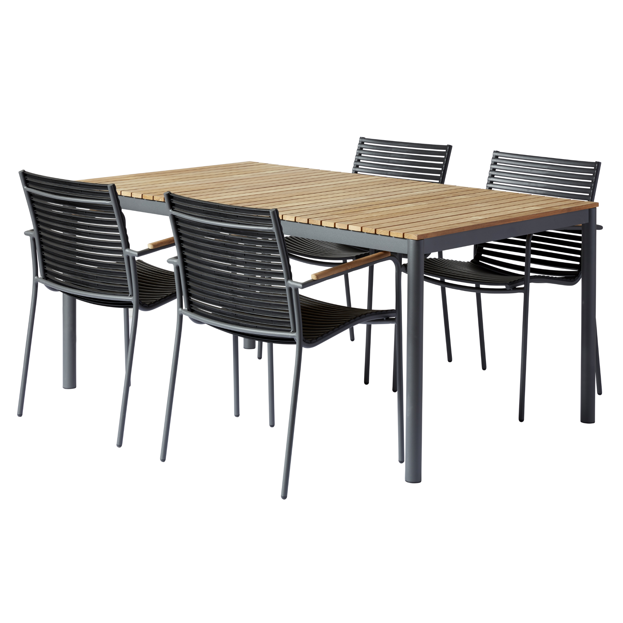 Når det solide teakbord bliver sat sammen med fire Mood Classic stole og skaber en rolig, gennemtænkt ramme om udelivet. Kombinationen af varme teaklameller og antracitfarvet aluminium giver et udtryk, der både føles tidløst og nutidigt.