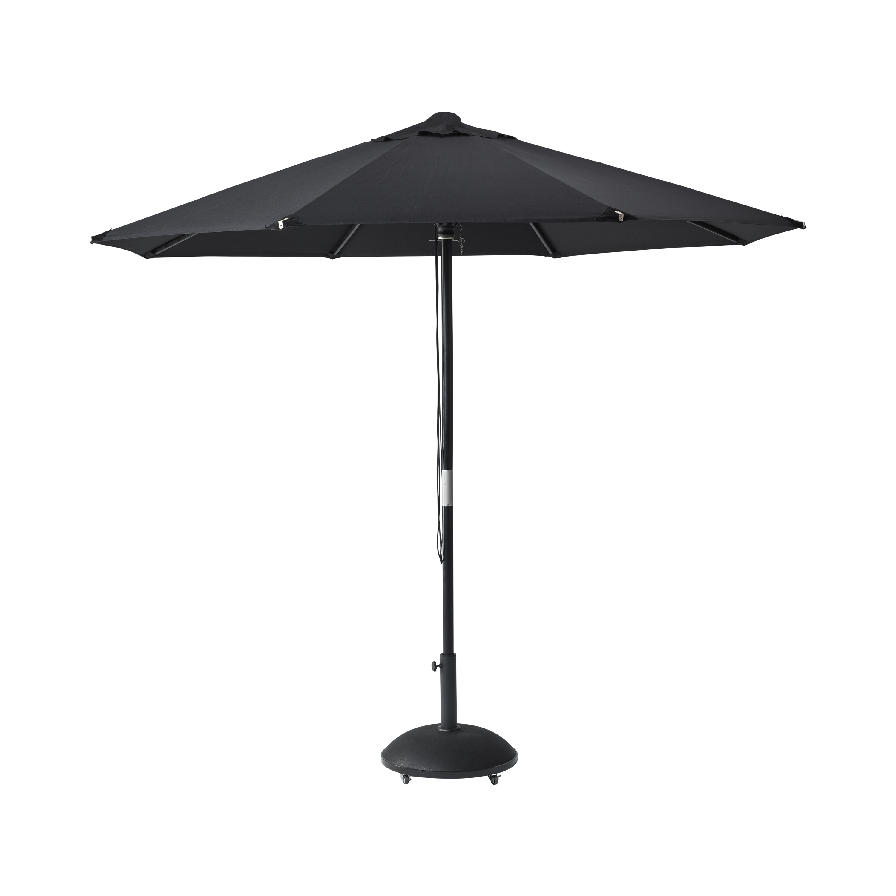 En rund parasol i fuld sort – både stok og dug – syet i farveægte polyester og med en diameter på 300 centimeter. Skabt til et skarpt, ensartet udtryk på terrassen, altanen eller i gårdhaven.