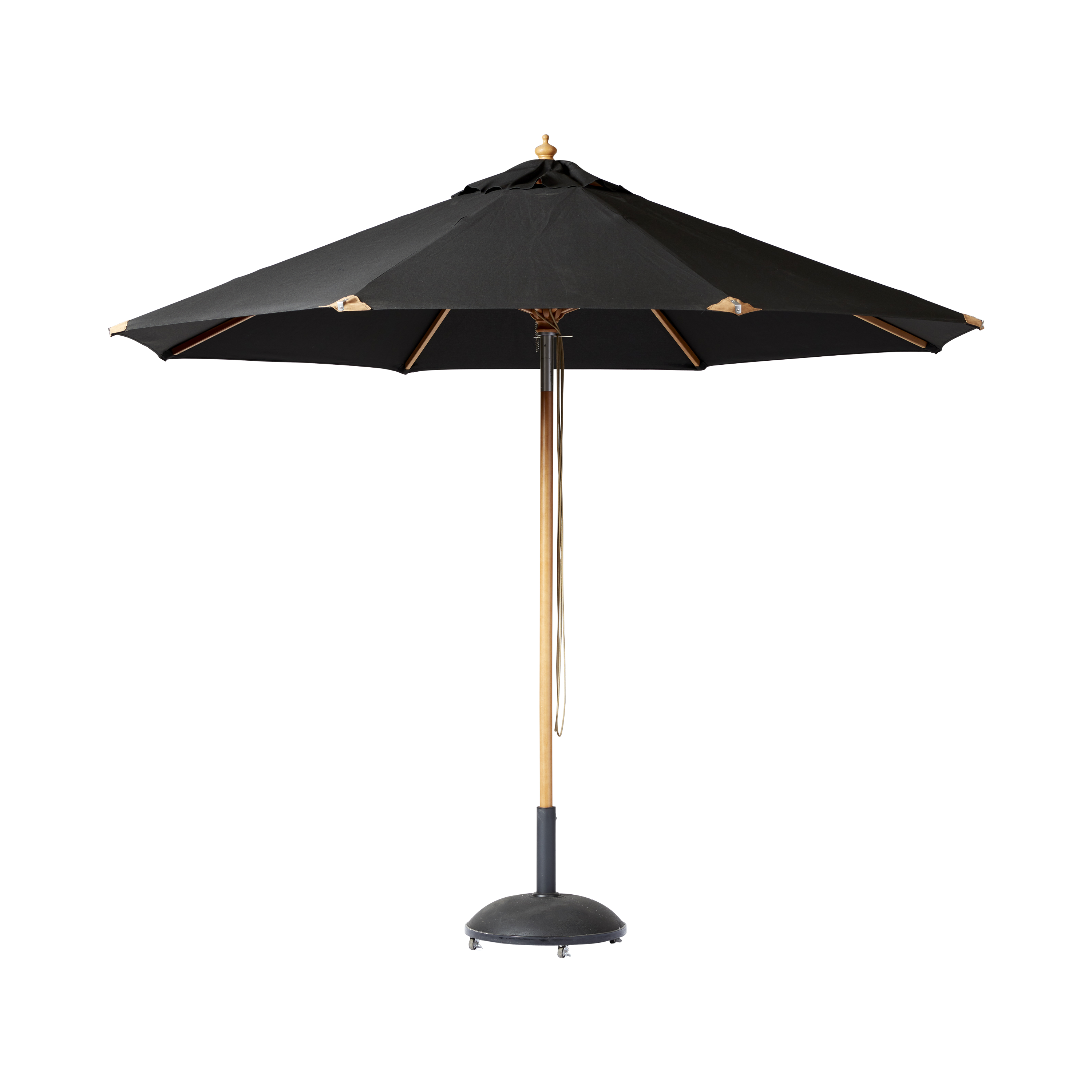 En rund parasol i sort, syet i farveægte olefin og med en diameter på 330 centimeter – skabt til fleksibel skygge på terrassen, i haven eller ved spisebordet, hvor rotate-tilt gør det let at justere skyggen efter solen.